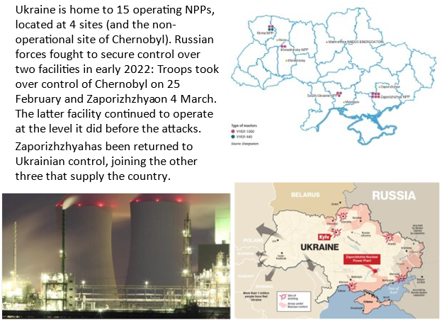 Figure 1. Ukraine's nuclear power plants and Russian actions, 2022. Map upper right from World Nuclear Association, found at  https://www.world-nuclear-news.org/BlankSiteASPX/media/WNNImported/mainimagelibrary/places/Ukrainemap730411_WNA.jpg?ext=.jpg; bottom left graphic Russia Seizes Ukraine Nuclear Plant after Fire, Georgia Today, Zaporizhzhia Fire, found at https://georgiatoday.ge/wp-content/uploads/2022/03/thumbs_b_c_6af7db0f8f30b13ff594f2f0bc70cd86.jpg; bottom right map, New York Post, What does Russia’s seizure of Ukraine’s largest nuclear power plant mean? Map found at https://nypost.com/wp-content/uploads/sites/2/2022/03/russian-control-ukraine-nuclear-plant-07.jpg?quality=90&strip=all