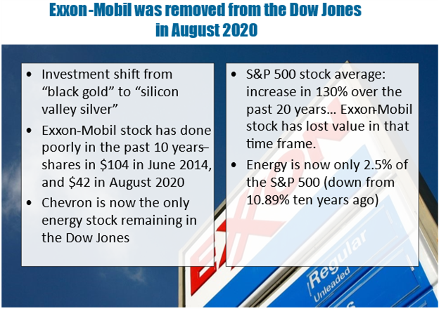 Figure 13. Exxon-Mobil removed from Dow Jones August 2020. Source: Camila Domonoske, NPR, 25 August 2020, Exxon Mobil Exits: The Dow Drops Its Oldest Member, image found at https://img.theepochtimes.com/assets/uploads/2022/06/03/gas-prices-4-700x420.jpg
