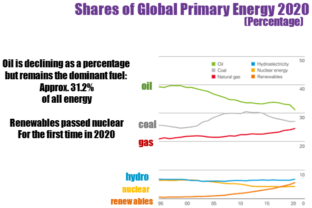 Figure 14. Shares of Global Primary Energy 2020 (percentage). Source: BP Statistical Review of World Energy 2021, p. 12, found at https://www.bp.com/content/dam/bp/business-sites/en/global/corporate/pdfs/energy-economics/statistical-review/bp-stats-review-2021-full-report.pdf.