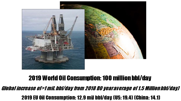 Figure 15. 2019 World oil consumption: 100 million bbl/day. Source: BP Statistical Review of World Energy 2020 and IEA December 2020, data found at https://www.bp.com/content/dam/bp/business-sites/en/global/corporate/pdfs/energy-economics/statistical-review/bp-stats-review-2020-full-report.pdf and https://www.iea.org/reports/oil-market-report-december-2020