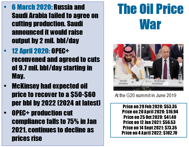 Figure 18. The oil price war. Source: Oil price based on Brent Crude as reported by oilprice.com. Image found at https://newlinesinstitute.org/wp-content/uploads/GettyImages-1152489863-2.jpg