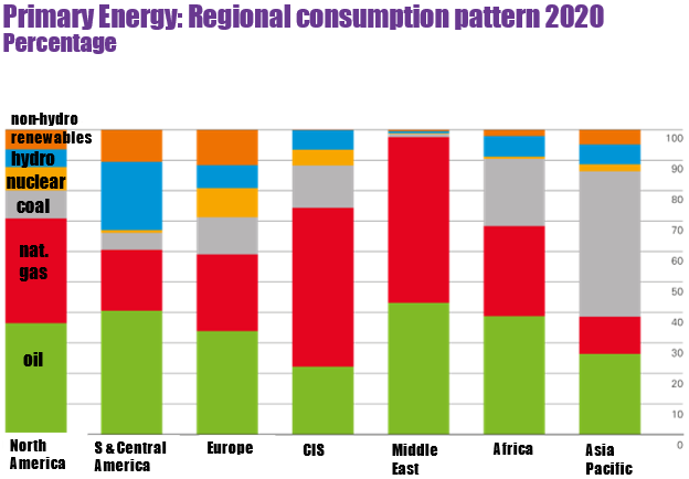 Figure 19. Primary energy: regional consumption pattern 2020 percentage. Source: Statistical Review of World Energy 2021, p. 12, found at https://www.bp.com/content/dam/bp/business-sites/en/global/corporate/pdfs/energy-economics/statistical-review/bp-stats-review-2021-full-report.pdf.