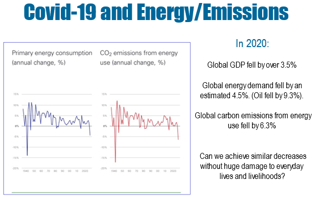 Figure 21. COVID-19 and energy/emissions 2020. Source: Spencer Dale, BP Chief Economist, presentation on 12 July 2021.  Source: graphic at https://www.bp.com/en/global/corporate/energy-economics/statistical-review-of-world-energy/chief-economist-analysis.html