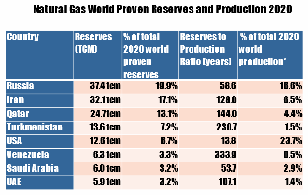 Figure 7. Natural gas world proven reserves and production 2020 (* Excludes gas that is flared or reinjected. Source: BP Statistical Review of World Energy July 2021, British Petroleum [at end of 2020] in TCM, pp 34 & 36, found at https://www.bp.com/content/dam/bp/business-sites/en/global/corporate/pdfs/energy-economics/statistical-review/bp-stats-review-2021-full-report.pdf