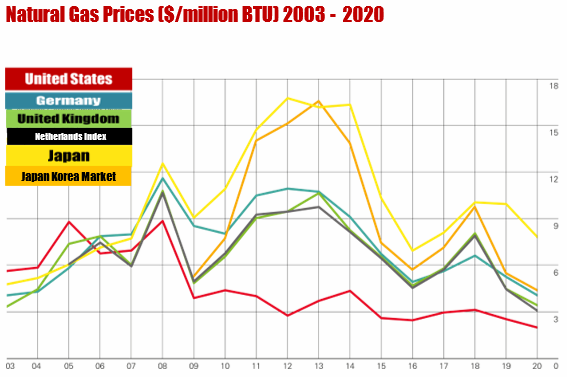 Figure 8. Natural gas prices ($/million BTU) 2003–2020. Source:  Statistical Review of World Energy 2021, p. 41, found at https://www.bp.com/content/dam/bp/business-sites/en/global/corporate/pdfs/energy-economics/statistical-review/bp-stats-review-2021-full-report.pdf.