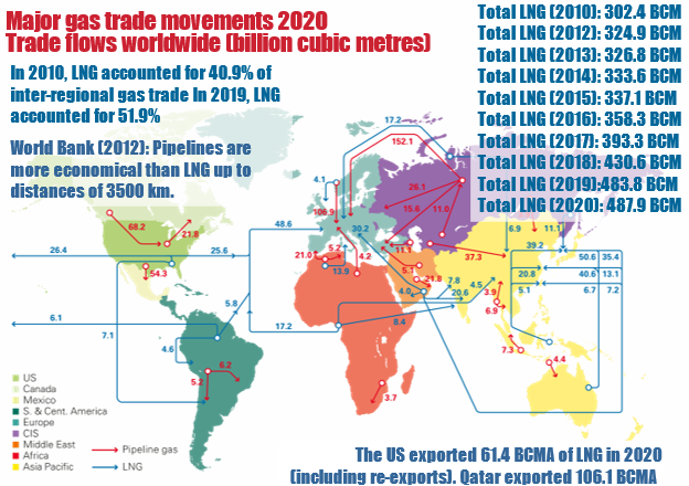 Figure 9. Major gas trade movements 2020, Trade flows worldwide (billion cubic meters). Source: Image and data from BP Statistical Review of World Energy 2021, p. 33, 42 44, found at https://www.bp.com/content/dam/bp/business-sites/en/global/corporate/pdfs/energy-economics/statistical-review/bp-stats-review-2021-full-report.pdf and includes data from FGE MENAgas service, HIS.